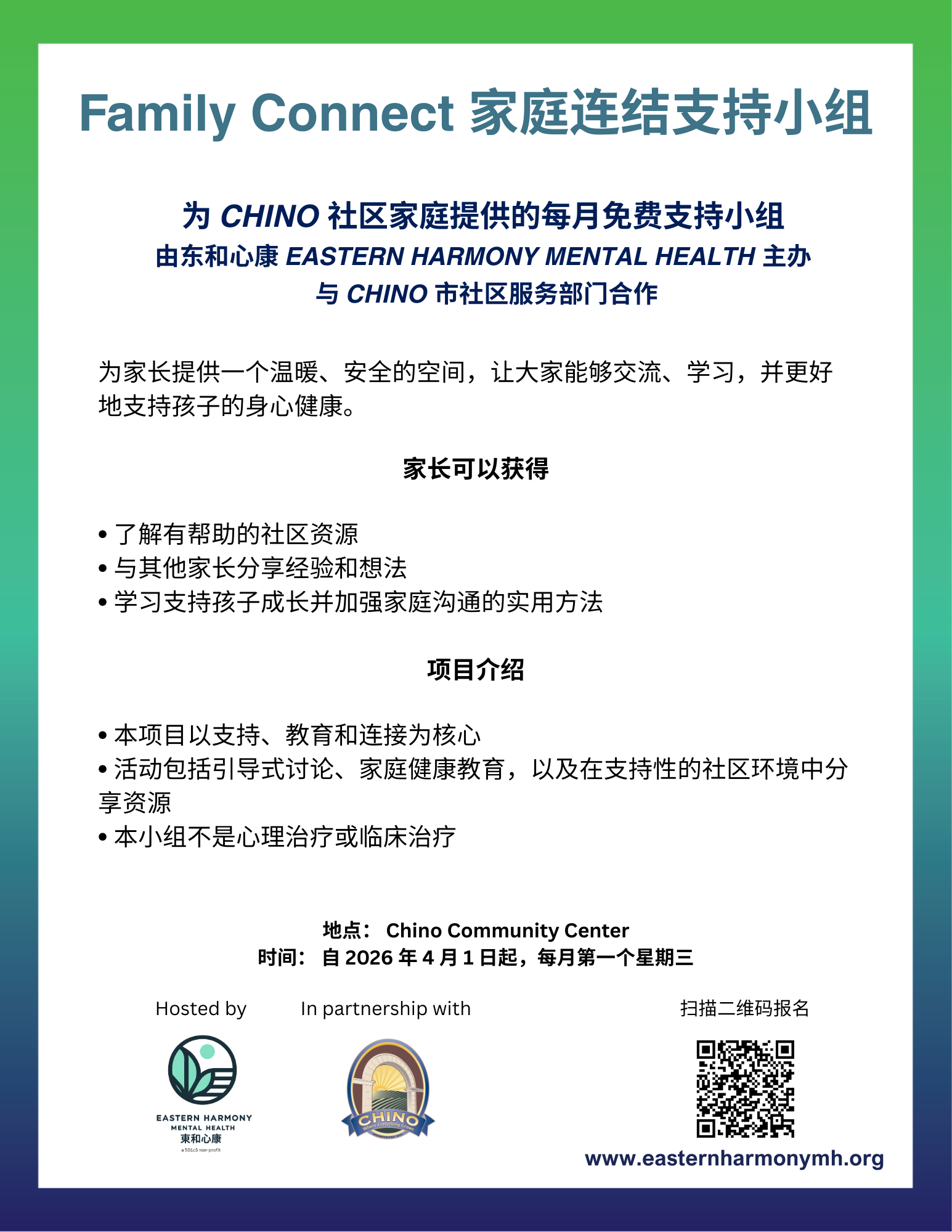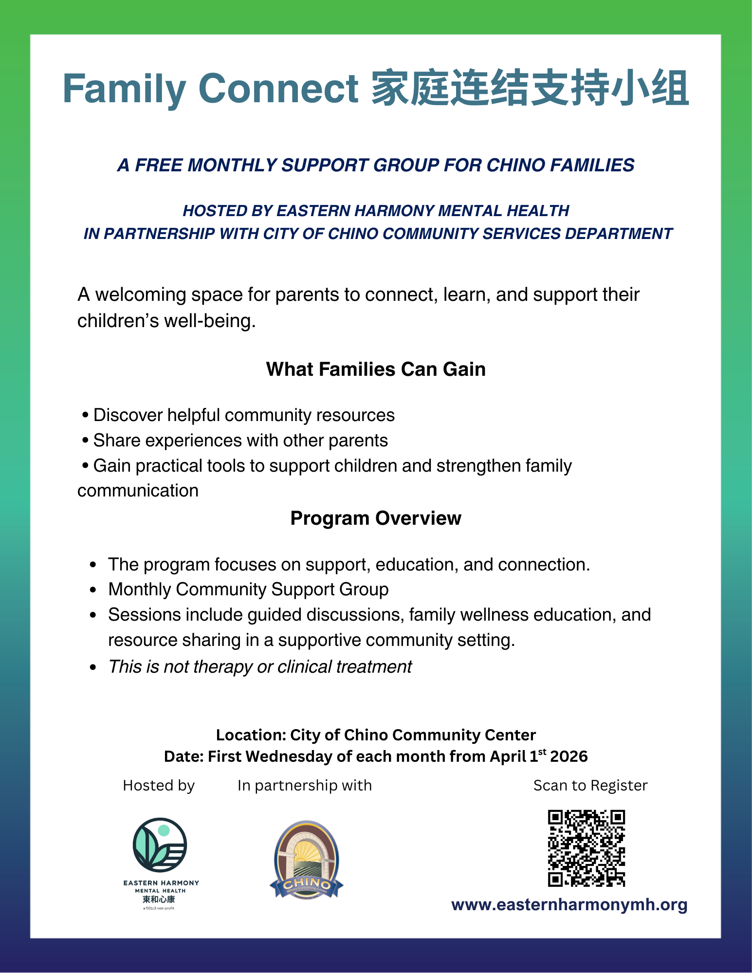 Eastern Harmony Mental Health family support groups are peer-support and educational programs. They do not provide clinical diagnosis, therapy, or emergency mental health services. If you are experiencing a mental health emergency, please call or text 988 or seek immediate professional assistance.